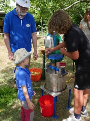 So konnte unter den Erklärungen der Imkerin Ingrid Vorholt ein Bienenvolk bei der Arbeit beobachtet werden, sogar in Ihren Bienenstock haben sich die fleißigen Insekten schauen lassen. Unter der Anleitung von Christian Lynen wurde frischer Apfelsaft gepresst. Die Apfelbäume des Gartens warteten schon sehnlich auf die Ernte ihrer Früchte und wer genau hingehört hat konnte ein leises „Ach schüttel mich, ach schüttel mich, meine Äpfel sind alle miteinander reif“ hören. Dem Wunsch wurde dann auch entsprochen und durch kräftiges Rütteln konnte bereits ein Großteil der reifen Äpfel vom Baum geholt werden. Die Äpfel wurden dann von den fleißigen jungen Helfern gesammelt, gewaschen, zerkleinert und schließlich von Hand gepresst. Die Arbeit hat sich gelohnt und so konnten einige Liter eines wunderbar fruchtig-süßen und goldbraunen Apfelsafts gewonnen werden, den alle Besucher mit einem Stückchen Kuchen vom reichhaltigen Büffet genießen konnten.