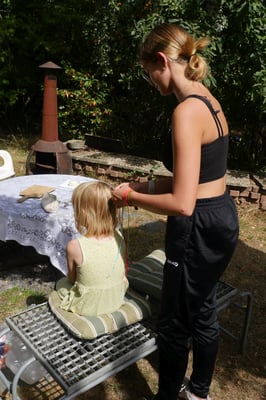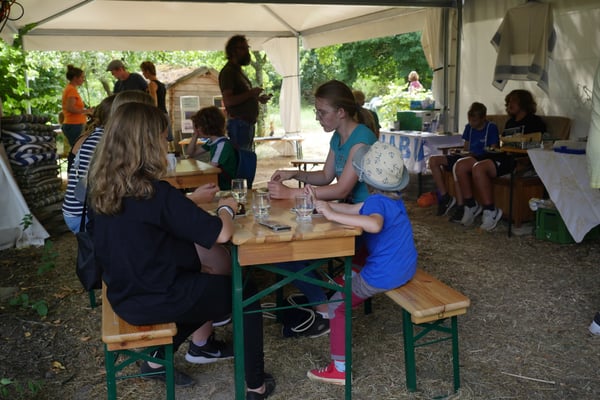 Beim NAJU-Kid Paula konnten sich die Kinder bunte Zöpfe flechten lassen und Carola De Marco führte alle interessierten durch die verschiedenen Bereiche und zeigte die vielen verschiedenen Gemüse, Kräuter und anderen Pflanzen, die hier prächtig gedeihen dürfen, so konnten neben typischen Küchenkräutern wie Basilikum oder Rosmarin auch viele andere essbare Kräuter wie Brennnesseln, oder Giersch probiert werden.