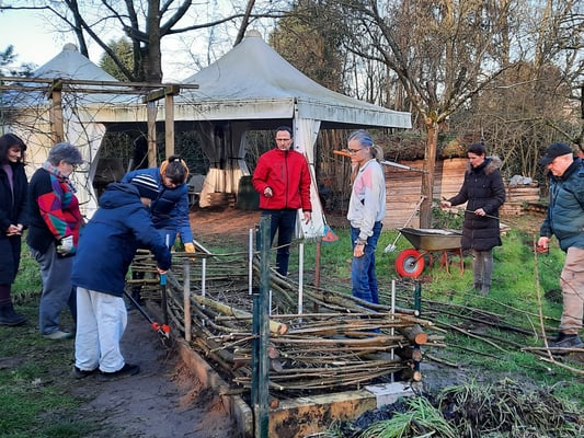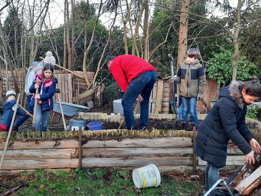 Eltern und Kinder arbeiteten mit vereinten Kräften an zwei Hochbeeten. Aus frisch gesägten Haselnussästen sind Flechtwände entstanden und anschließend wurden die Beete mit frischer Erde aufgefüllt.