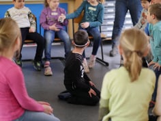 Zum Schluss wollten alle Waldkauz sein und mit verbundenen Augen hören wo sich die Maus befindet. Dafür wurde einem Kind die Augen verbunden und alle anderen Kinder haben sich im Kreis gesetzt und heimlich ein Stück zerknittertes Papier weitergereicht. Wurde "Stopp" gerufen musste das Kind erraten, wo sich die "Beute" befindet.