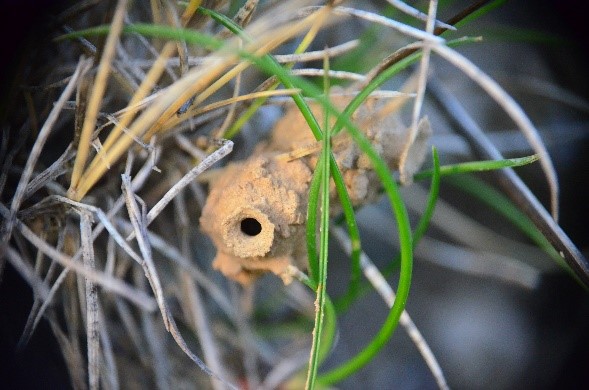 In dieses Gebilde legt sie ein Ei und trägt anschließend Schmetterlingsraupen ein, die sie durch einen Stich mit ihrem Stachel gelähmt hat, diese dienen dann als Nahrungsvorrat für den Wespennachwuchs. Wenn alles verzehrt ist, verpuppt sich die Larve und überwintert in ihrer verschlossenen Unterkunft, die an einem Halm befestigt und wohl wasserdicht ist. Wobei es Pillenwespen gibt, die mehrere Generationen im Jahr hervorbringen. Ob die Unterkunft der Sommergenerationen dieselben Eigenschaften hat, wie die der Überwinternden kann ich nicht sagen. Ich habe die Nester mal einzeln oder in kleinen Gruppen vorgefunden und sie waren entweder an trockenen Halmen oder an Kiefernnadeln angebracht. Da sowohl bei den „toten“ Halmen als auch bei den Kiefernadeln kein Dickenwachstum mehr zu erwarten ist, besteht auch nicht die Gefahr, dass der „Behälter“ durch sich ausdehnende Pflanzenteile Schaden nimmt und Risse bekommt.