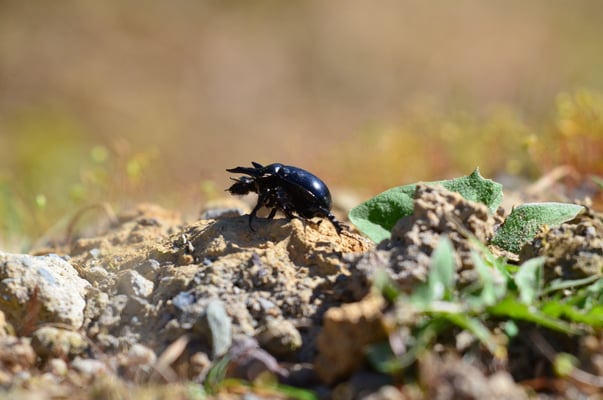 Der Stierkäfer gehört zu den Mistkäfern und wirkt mit seinen drei „Hörnern“ etwas bizarr. Er hat sich auf die kleinen Hinterlassenschaften von Kaninchen, Hasen, Rehen oder Schafen „spezialisiert“, alles Tiere, die im Offenland zuhause sind. Die „Beute“, die wohl recht frisch sein sollte, da sie dann besonders verführerisch duftet, holt ausschließlich das Männchen. Es schaut ein wenig unbeholfen aus, wenn der Käfer das Kotkügelchen mit dem vorderen Beinpaar ergreift und vor sich her trägt, etwa so wie wir Menschen einen Getränkekasten tragen. „Zuhause“ angekommen wird die Fracht ablegt, um zum Höhleneingang zu krabbeln und dort nachzuschauen, ob alles in Ordnung ist. Notfalls werden Hindernisse, wie vom Wind herbei gewehte Pflanzenstückchen oder Steinchen, weggeräumt. Wenn der Käfer den Höhleneingang freigelegt hat, krabbelt er rückwärts mit dem Objekt der Begierde hinab zum Weibchen, das dann Eier neben die zukünftige „Kindernahrung“ ablegt. Wobei die erwachsenen Käfer dieselbe Nahrung zu sich nehmen. Die etwa fingernagelgroßen schwarzen Käfer haben kräftige, gezahnte „Grabbeine“, mit denen die Erde aufgelockert wird, und mit den hinteren zwei Beinpaaren wird der „Abraum“ aus dem Höhleneingang geschoben. So graben die kleinen Käfer im Durchschnitt über einen Meter tiefe Gänge, was im Winter den Nachwuchs z.B. vor starkem Frost schützt. Sie sind nicht häufig zu sehen, aber bei meiner zufälligen Sichtung war wohl ein verlockender Duft in der Nähe vom Käfer-Unterschlupf derart intensiv, so dass er nicht wiederstehen konnte