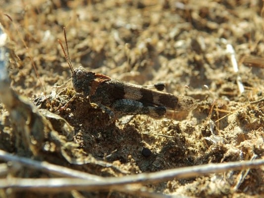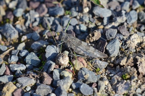 Die Blauflügelige Ödlandschrecke und ihre „Schwester“, die Blauflügelige Sandschrecke, werden häufig nur wahrgenommen, wenn sie auffliegen. Beide sonnenverliebten Arten sind auf offene Bodenflächen angewiesen und je nach Untergrundfarbe, an die sie sich mit jeder Häutung anpassen, sind die Schrecken gelbbraun wie Sand, braun wie Mutterboden oder grau wie Schotter und Splitt. Sie ernähren sich überwiegend von Gräsern, die vereinzelt dort wachsen. Unterscheiden kann man die Sand- von der Ödlandschrecke bei genauem Hinsehen unter anderem am Nackenschild. Die Ödlandschrecke (Bild links) hat einen dachfirstförmigen, die Sandschrecke einen glatten Nackenschild (Bild rechts). Die Männchen der Sandschrecke laufen bei der Suche nach Weibchen umher. Treffen zwei oder mehrere Männchen aufeinander, betasten sie sich mit den Fühlern ohne jegliche Aggression und ziehen dann ihrer Wege. Treffen sie auf ein Weibchen, versuchen sie sogleich ihren Beitrag zur Arterhaltung zu leisten; sofern die „Angebetete“ zur Paarung bereit ist, kommen sie auch umgehend zum Zuge. Ist das nicht der Fall wird das kleinere Männchen einfach abgeschüttelt. Die Weibchen legen ihre Eier im Boden ab, wo diese dann überwintern. Im Frühling tauchen dann die flugunfähigen Nymphen der Blauflügelschrecken auf, die zunächst nicht größer sind als kleine Ameisen. Verfolgern entkommen sie durch weite Sprünge. Die namensgebenden blauen Hinterflügel sieht man nur, wenn die erwachsenen Schrecken auffliegen.