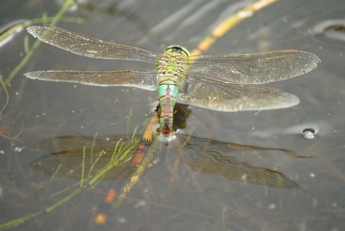 Als Imago, also als fertiges Insekt lebt die Große Königslibelle bis zu acht Wochen, wobei diese Art recht schnell neue Lebensräume erobert. Die Weibchen erscheinen nur zur Paarung und zur Eiablage am Gewässer. Am 16.06.2017 habe ich ein Weibchen bei der Eiablage „erwischt“. Wenn man genau hinschaut, dann kann man erkennen, wie beweglich der Hinterleib ist. Damit nicht für jedes abzulegende Ei die Position gewechselt werden muss, ist das auch nötig.