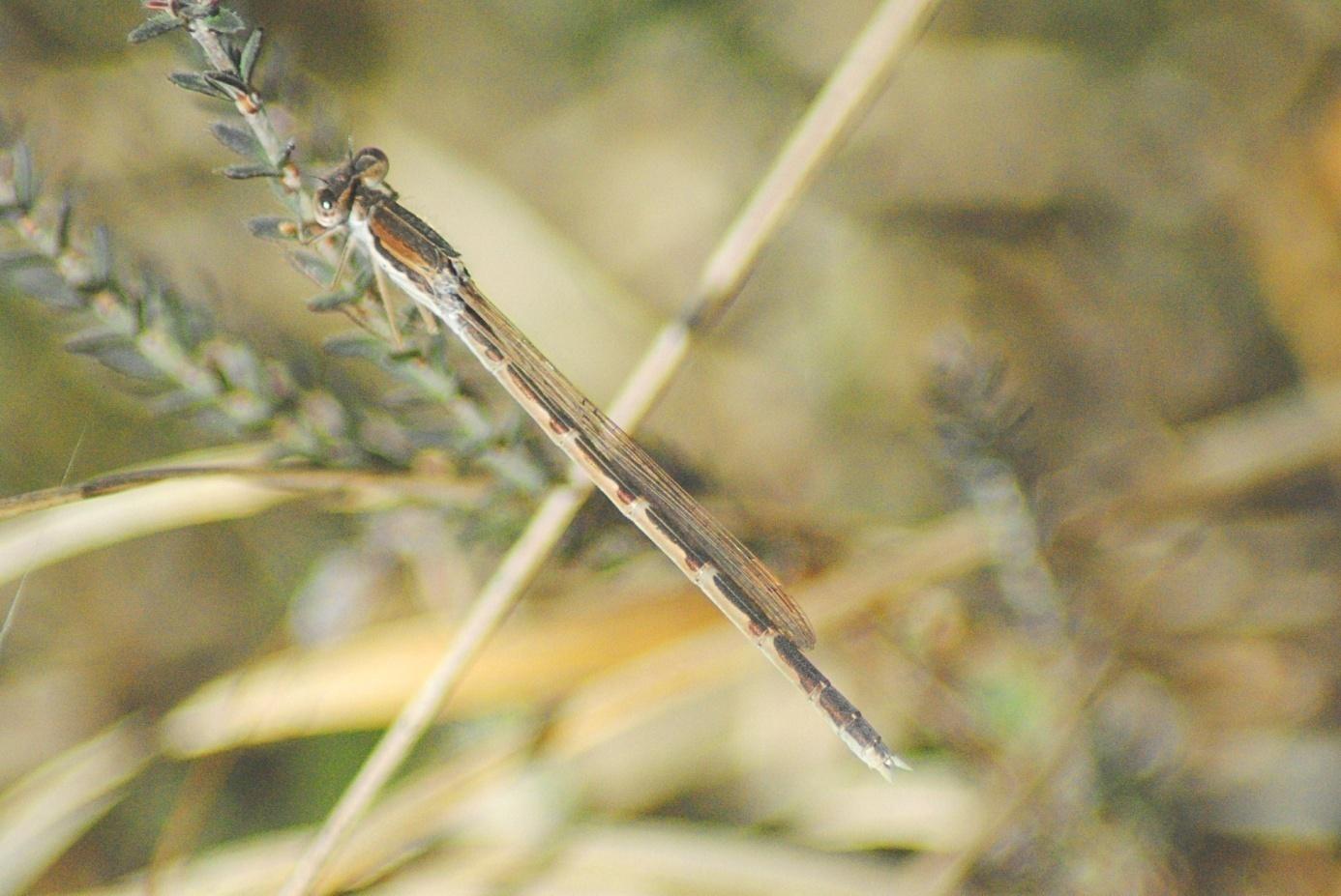 Die Flügelmale der Kleinen Binsenjungfer sind rötlich-braun und auf beiden Seiten von einem hellen Rand begrenzt.