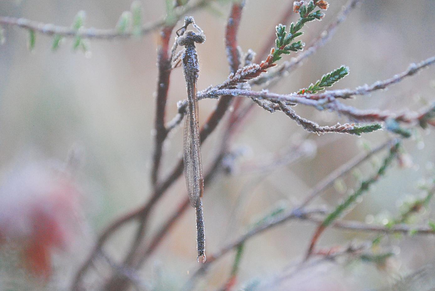 Die Kleine ist die späteste der Binsenjungfern, die im Jahr auftaucht, ihre Flugzeit erstreckt sich in unseren Breiten von Juli bis November und so kommt es immer wieder vor, dass gerade sie mit Frost in Kontakt kommt.