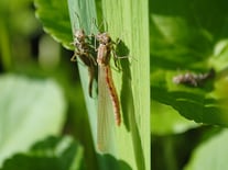 Wenn Libellen schlüpfen, dann sind die Flügel und der Hinterleib noch auf die Größe und Länge der Nymphenhaut reduziert. Sobald die Libelle geschlüpft ist, sucht sie in der Regel einen sonnigen Platz auf, um sowohl Flügel als auch Hinterleib mit Flüssigkeit zu füllen. Dieser Vorgang kann sich über mehrere Stunden hinziehen und birgt so manche Gefahren für die junge Libelle. Die Witterung spielt eine wichtige Rolle. Ist es zu heiß und windig, dann droht die Libelle schnell zu trocknen. Regnet es und die Temperaturen sinken, dann kann die Libelle erfrieren. Ebenso können sie Räubern, wie Vögel oder Ameisen zum Opfer fallen.