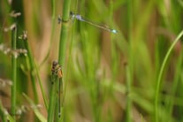Aber die kleine Binsenjungfer ist auch ein geschickter Flugjäger, sonst wäre sie nicht in der Lage unter Anderem die flinken Schwebfliegen zu fangen.