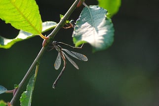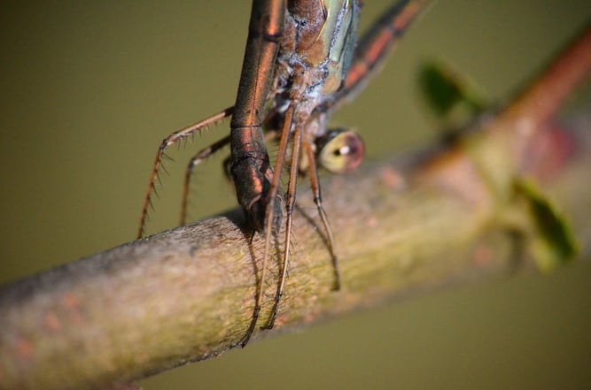 Wenn sich die Libelle beobachtet fühlt, verharrt sie erst mal im Vertrauen auf ihre Tarnung.