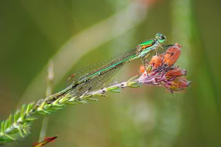 Metallisch grün glänzen die kleinen Libellen, hier ein Weibchen auf einer verblühten Glockenheide.